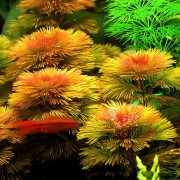 双子叶植物,挺水性水草。水上草与水中草不同型,水上草的叶片较肥厚,狭披针形三轮生叶,叶端尖细,绿色,叶缘有细锯齿状,在叶腋会长出花梗,开出粉紫色的漏斗形花朵,每朵有5片花萼。茎上常有茸毛。成长快速的高茎植物,适合群植于深水族箱。叶轮可达15公分长,但一般较小,每根茎上长出18~22片完全分离的叶子。水中草的叶片为羽状叶,从主干辐射而出,上小下大似宝塔形18~22枚轮生,叶色黄绿,以平面伸展的方式由茎向外扩散生长。