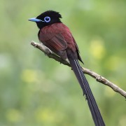 在成年雄鸟的脸上耳部附近有一块红色的斑点,胸部和上腹部的羽毛棕色,有浅灰色边框,这些地方呈现出鳞片状外观;底部的其他的地方的和翅膀的一部分覆羽鲜红色;顶帽、颈部和背部黑色,臀部和尾巴形成明显的对比,是暗红色。一、二级飞羽和外侧覆羽深红色。尾巴相对较短,为黑色。鸟喙黑色,虹膜酱色,腿灰色。