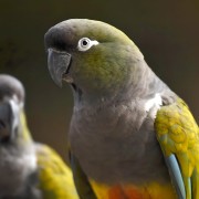 幼鸟至少要等到12个月才能长成为成鸟那种体色。是一种双形性的品种;就是成鸟的性别来可以经由色彩不同而区别出。雄鸟通常比雌鸟大一点,它们都有宽阔的头,上颚有点大。雄鸟的头及前胸是棕灰色带一点桔色,就像它的名字一样;胸部是深桔色的,臀部是黄绿色,尾部及腹部是绿色,喙是灰黑色,脚是灰色,眼睛的虹膜是暗桔色。雌鸟的颜色和雄鸟相似,但雌鸟没有桔色的胸部,而且上颚比较窄小。从外观上很容易区分。