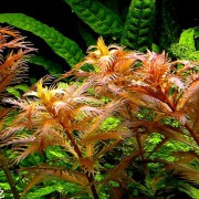 比较罕见的亚洲产皇冠草改良品种,由印度尼西亚的水草养殖场推出。中小型水草,个头不高。椭圆形的叶片较宽。水上叶为绿色,上面混杂着红褐色的斑点。水中叶为红色系的,尤其是新叶,呈鲜艳的红色,上面有很多褪色的斑点,色彩独特,十分优美。外侧老叶的颜色会逐渐变为深绿色,别有一番素雅的韵味。